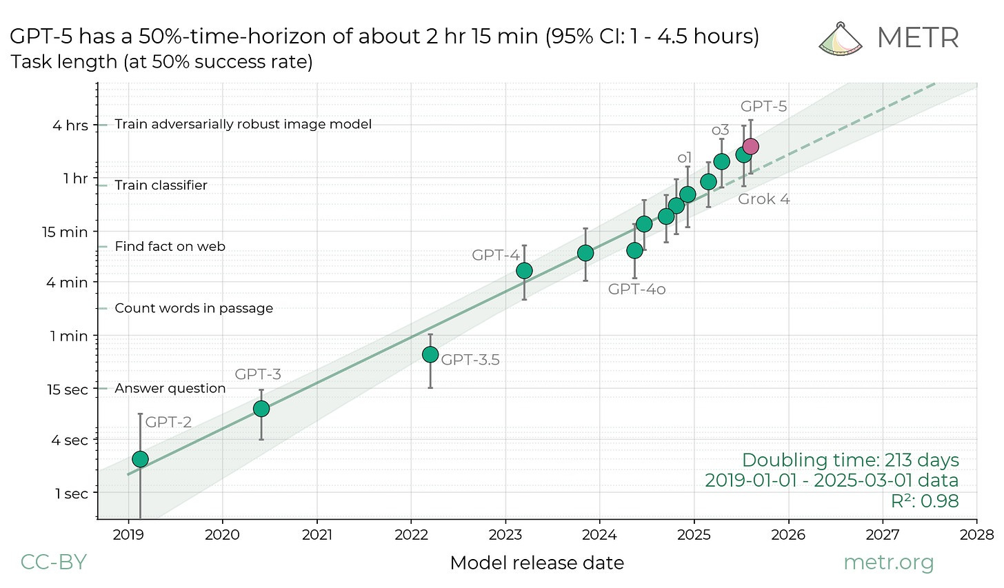 Actually, the graph shows the size of tasks for which the success rate is 50%. The size of tasks which AIs can reliably carry out is much less. Also note that the measurements are specifically for software engineering-style tasks that can be graded automatically (e.g. “does this code pass tests”, not “is it easy to understand and consistent with style guidelines”), and the time scale is calibrated against human engineers who are not familiar with the specific codebase the task applies to.