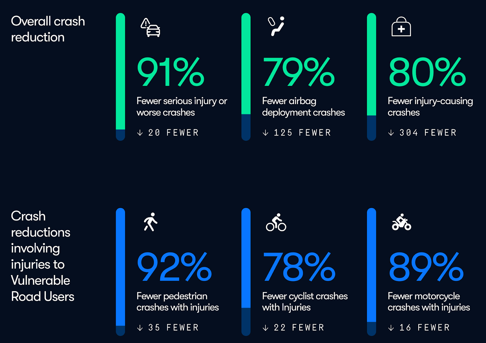 Last December, Waymo and Swiss Re released another study, this time covering 25 million miles of autonomous driving. This study found “an 88% reduction in property damage claims and 92% reduction in bodily injury claims”.