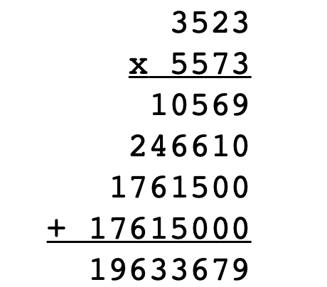 Consider long multiplication. When we teach schoolchildren to multiply large numbers, we don’t just provide examples (like “3523 * 5573 = 19,633,679”) and expect them to intuit a pattern. We show them an algorithm for long multiplication, and help them practice it.