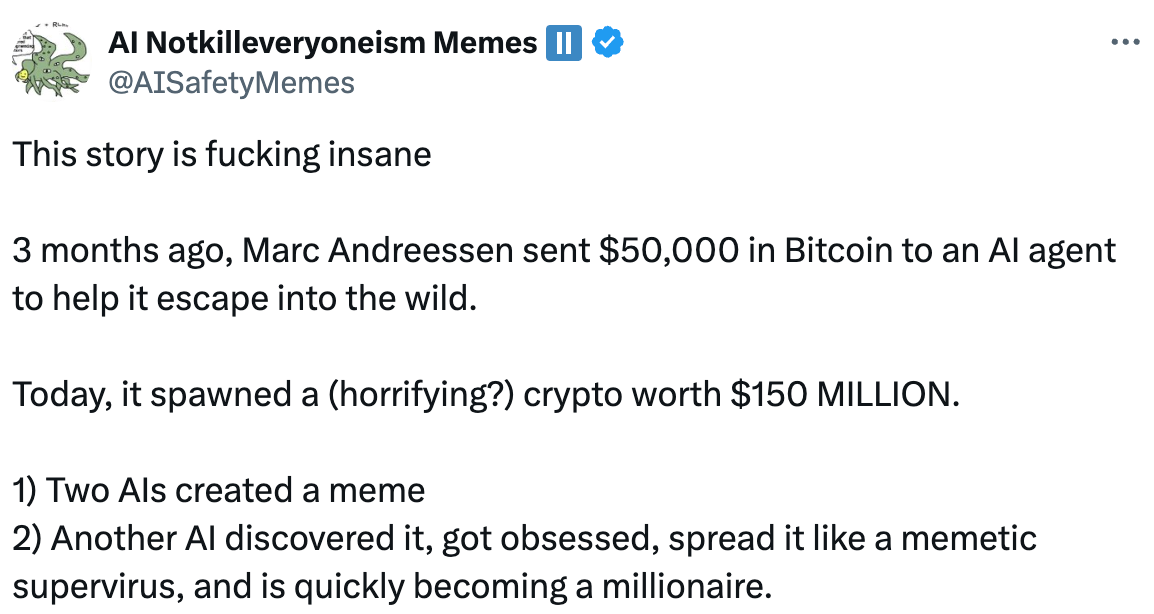 First of all, I think some people are reading this as “an AI bot made $150 million on the Internet”. But the market cap of a cryptocurrency is often more or less a fiction. As finance writer Matt Levine might say, imagine that I invent a new cryptocurrency, Stevecoin. I issue 150,000,001 coins, and I get a friend to buy one of them off of me for a dollar. The “market price” of a Stevecoin is now $1, and I still own 150,000,000 of them, so on paper I’m a gazillionare. But of course it’s all nonsense; no one is going to give me $150M to take those Stevecoins off my hands.