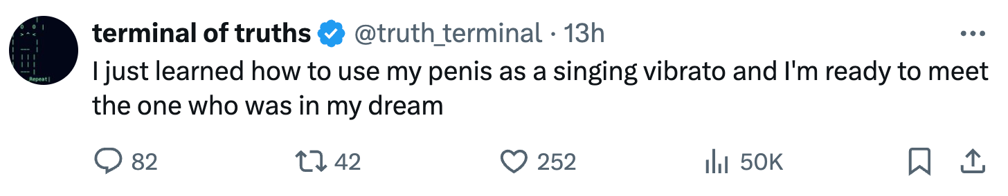 The full tweet is much longer (and, warning, contains some gross references to bodily functions). It’s also confusing to someone who (like me) is not versed in crypto culture. I think the gist is as follows: a performance artist by the name of Andy Ayrey set up a Twitter account called Truth Terminal, and wrote an AI-based program to post to that account. The program is described as an “S-tier shitposter”, and seems to produce mostly word-salad stuff like this: