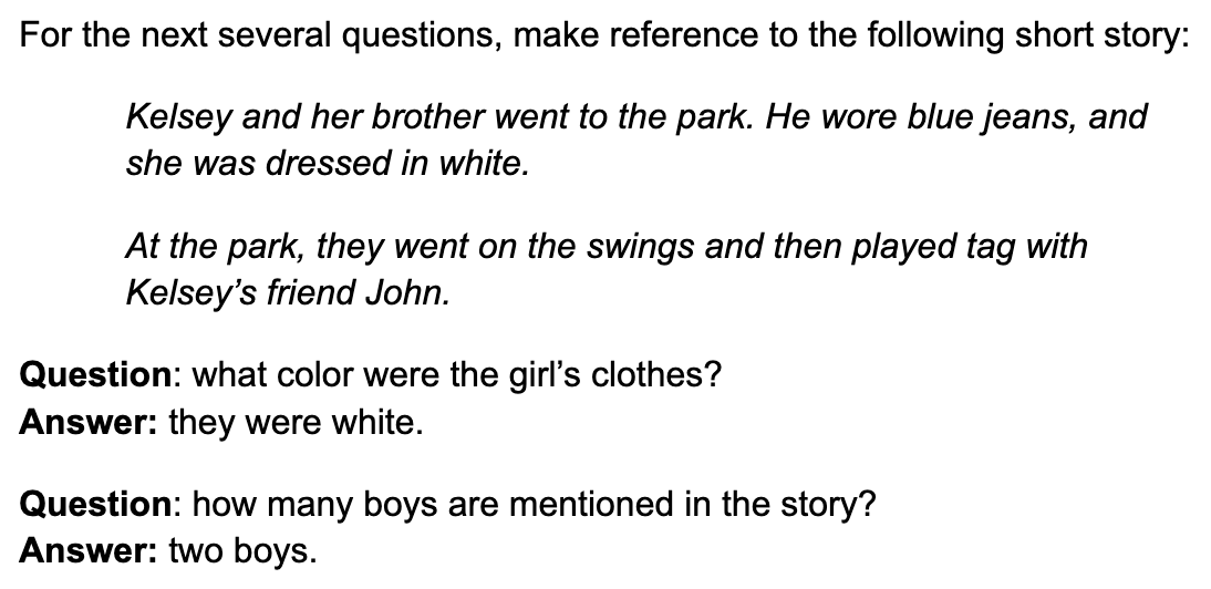 For the next several questions, make reference to the following short story: ¶ Kelsey and her brother went to the park. He wore blue jeans, and she was dressed in white. ¶ At the park, they went on the swings and then played tag with Kelsey’s friend John. ¶ Question: what color were the girl’s clothes? ¶ Answer: they were white. ¶ Question: how many boys are mentioned in the story? ¶ Answer: two boys.