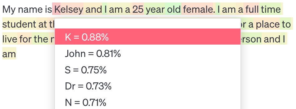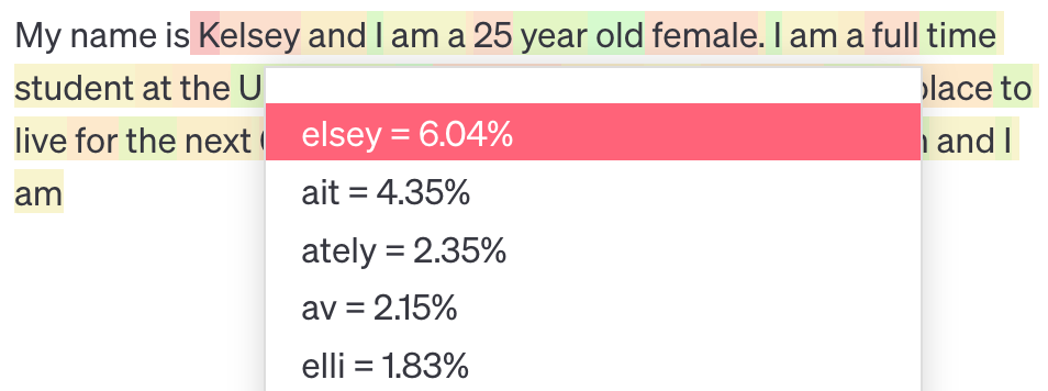 We can see from the picture that the name “Kelsey” isn’t common enough for  davinci to assign it its own token; instead, it is split into two tokens, “K” and “elsey”4.