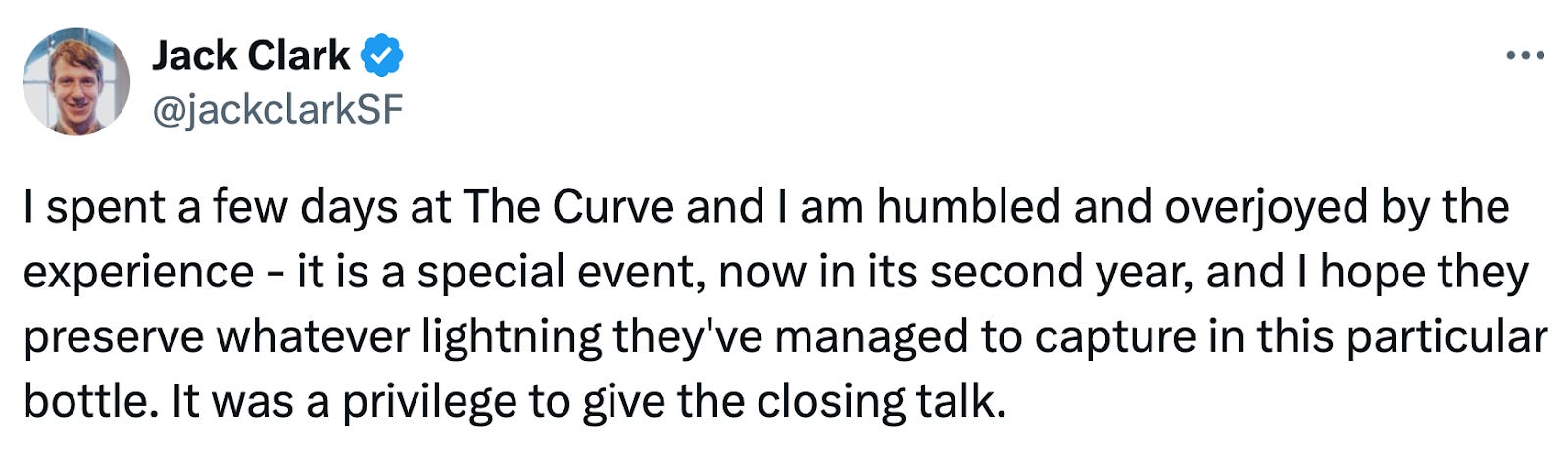 There’s a saying in politics called “the horseshoe theory”, which is that if you go to the far enough to the end of either political spectrum you end up with positions that are closer than those at the center. One thing I learned at The Curve is that this horseshoe theory might show up in an important way for AI safety. Very distinct communities (Bay Area alignment types, and the hard right) have a similar set of concerns (”AI systems might screw up society so much that we should be very careful in how they’re deployed”), meaning they could potentially form a coalition with one another. This, to me, illustrates what is so valuable about The Curve - it brings people together with radically different ideologies and worldviews and allows them to talk to one another until they identify surprising areas of overlap.