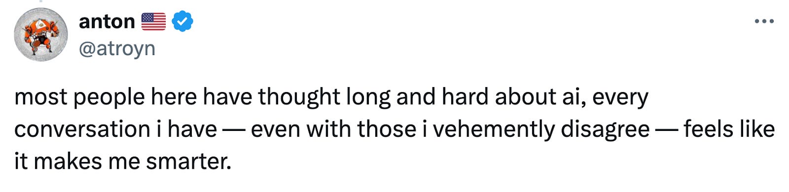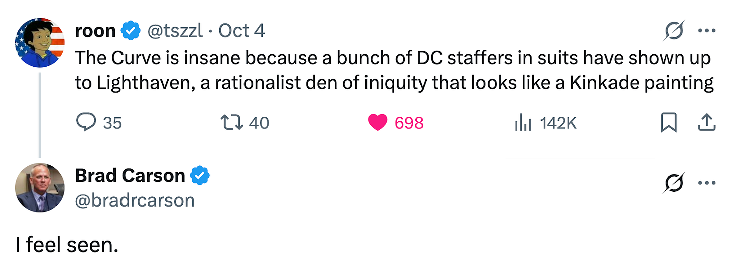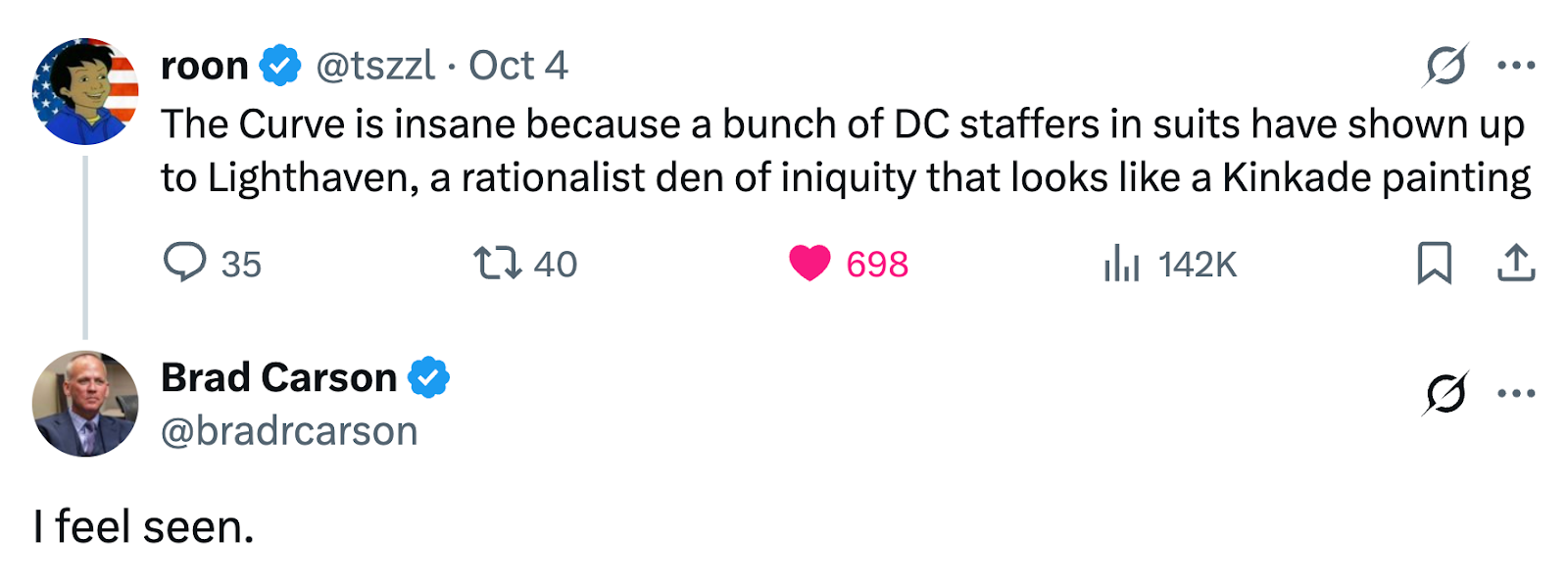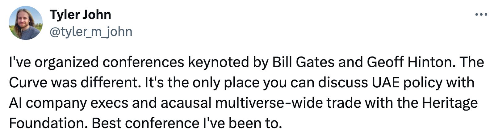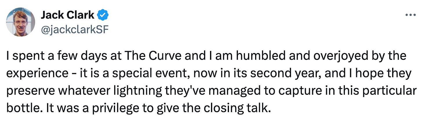 The biggest update for me was realizing just how much these different groups still have to learn from each other, and how low the barriers are to effective dialogue. One might think conservative think tankers, Hollywood actors, labor leaders, AI safety researchers, and members of the technical staff would all speak totally different languages. But at The Curve, you can find them jointly grappling with the risks and opportunities of transformative AI in their fullness. It’s a sight to behold!