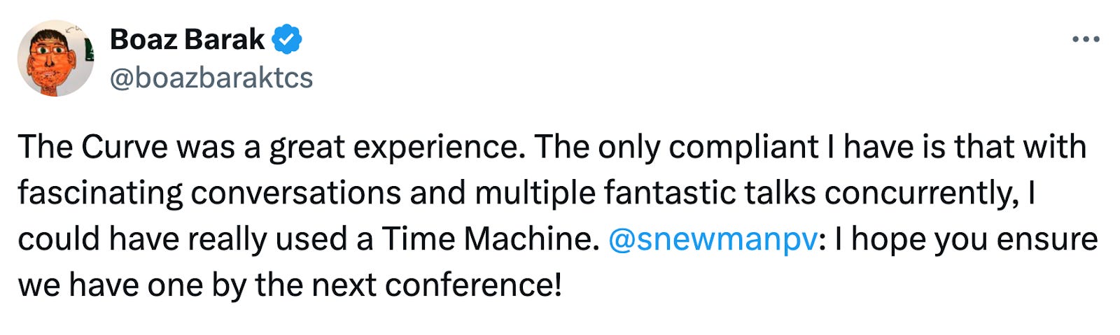 Bottom-line: The Curve sits at the Pareto frontier of professionally useful and pure fun, making it the single best AI conference in a super competitive field. It is easily the highlight of my year.