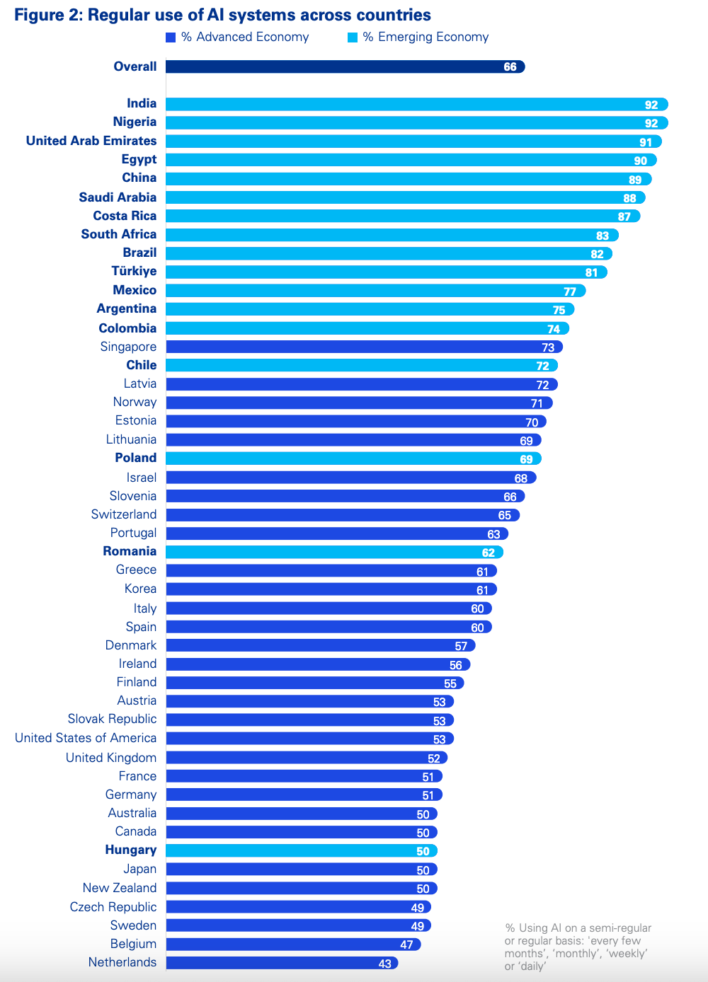But I was quite surprised that otherwise, the highest rates of self-reported AI usage are in India, Nigeria, Egypt, Costa Rica, South Africa, Brazil, and Turkey – around double the rates of some European countries and more than half again as high as the USA and UK.