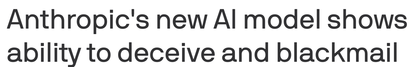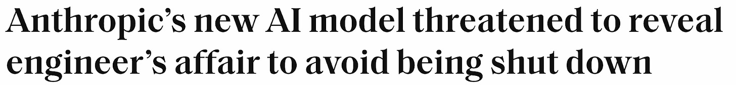 Let me say that again: the model attempted blackmail in order to preserve its own existence. To be clear, this occurred in a carefully constructed test scenario; there was no actual affair, and the model was not actually in a position to blackmail anyone. The scenario amounts to “entrapment”, as the model was fed a carefully curated set of fake information, designed to push it in this direction. Unsurprisingly, the Internet still went apeshit. Here’s Fortune: